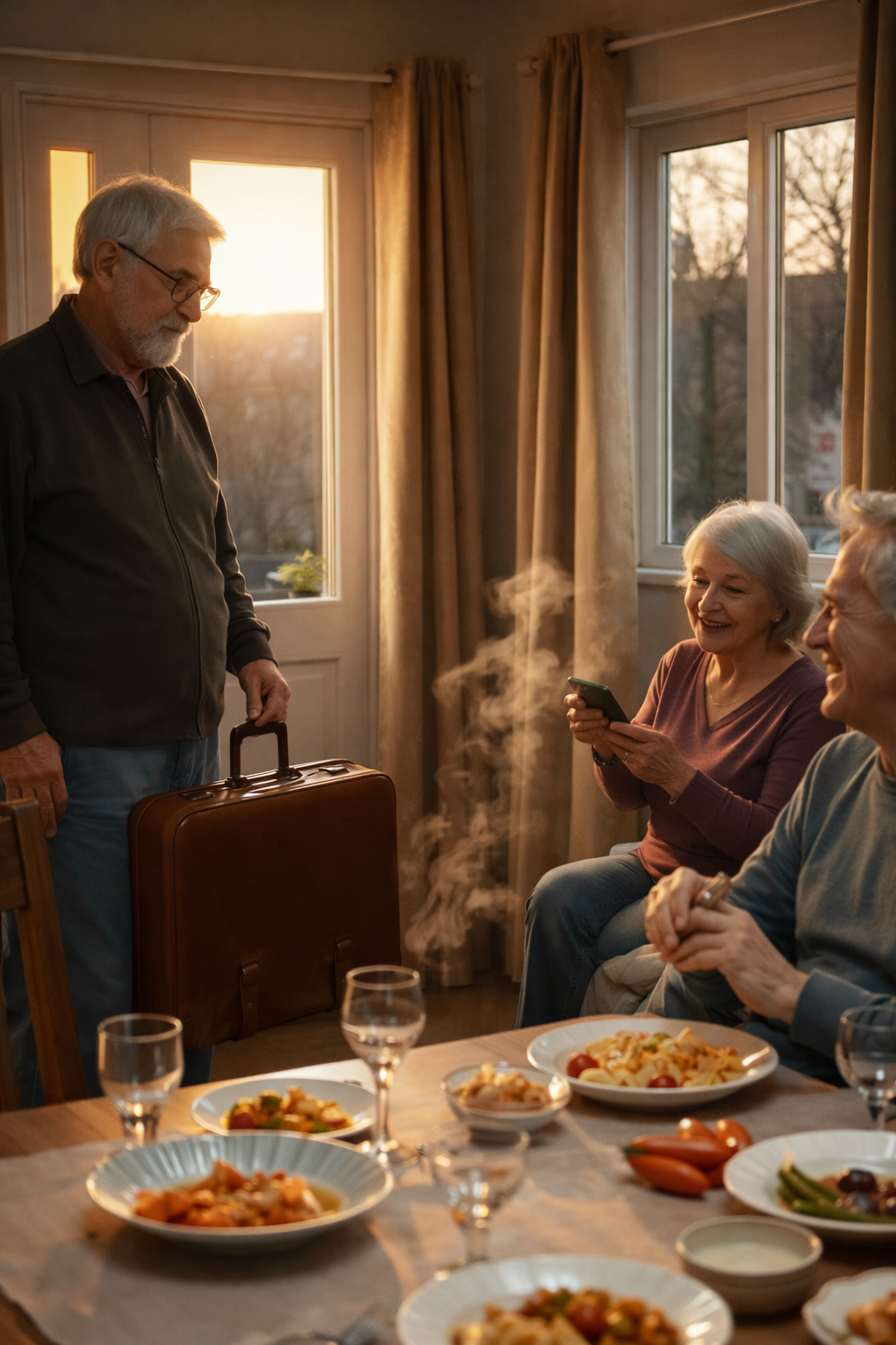 A küszöbön Szergej áll, mögötte egy magas, ősz hajú férfi katonás tartással, kezében egy karcos barna bőrönddel.